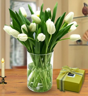 White tulips refer to charm, elegance, purity, and peace. Taking a white tulip for restoring peace and harmony in home is a lovely idea to goof up the house-warming occasion. As a home décor item, you can put this glass vase arrangement of 20 white tulips and 250 gms Patchi Chocolate in any corner and spice up the home space. So, surprise your loved ones with this unique gift.