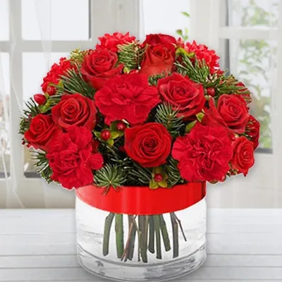 The color red symbolizes love, passion and excitement. For a gift that implies all that and more, this gorgeous arrangement of roses, and carnations in a glass vase. Please Note : These arrangements are assembled on the floral foam and are short stemmed . If you prefer longer stems ,they can be arranged directly in the glass vase and will differ from the image on the website . Kindly contact customer service for the same .